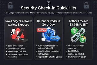Security Check-in Quick Hits: Fake Ledger Hardware Scams, Microsoft Defender Zero-Day, and Tether’s Swift Freeze on Rhea Finance Funds