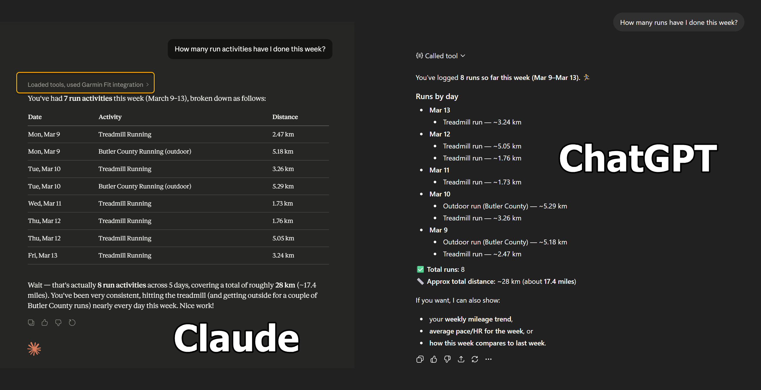 Once connected, you can have natural language conversations about your fitness data. A few examples: