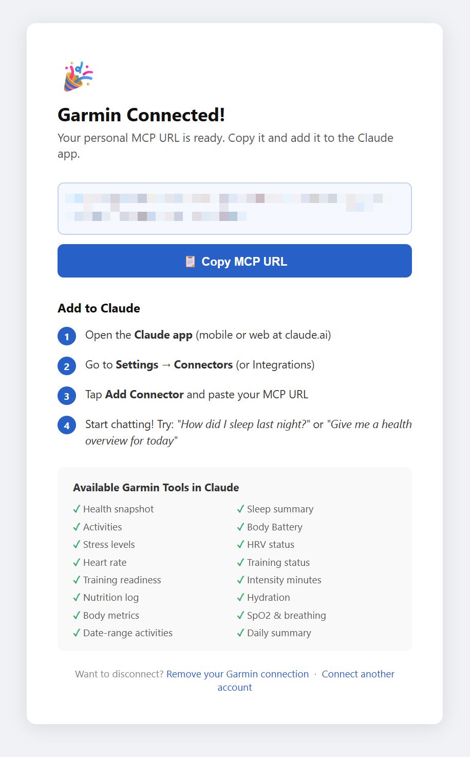 The Garmin Chat Connector solves that. It is a cloud-hosted Model Context Protocol (MCP) server that connects your Garmin Connect account to AI chat assistants. Ask Claude or ChatGPT about your sleep, your recovery, your weekly training — and get a real answer drawn from your actual Garmin data.