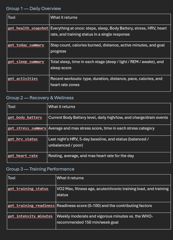 If you own a Garmin watch, you already know how much data it collects — steps, sleep stages, HRV, Body Battery, VO2 Max, training load, and more. The problem has always been accessing that data in a conversational way. You can tap through the Garmin Connect app, but you can’t just ask it a question.