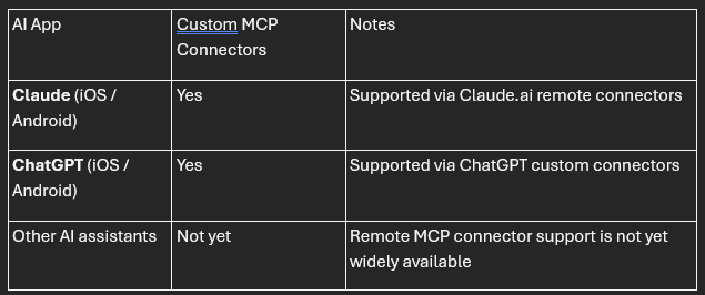 Claude and ChatGPT are currently the only mobile AI apps that allow users to plug in their own MCP servers. Other assistants may add this capability over time.