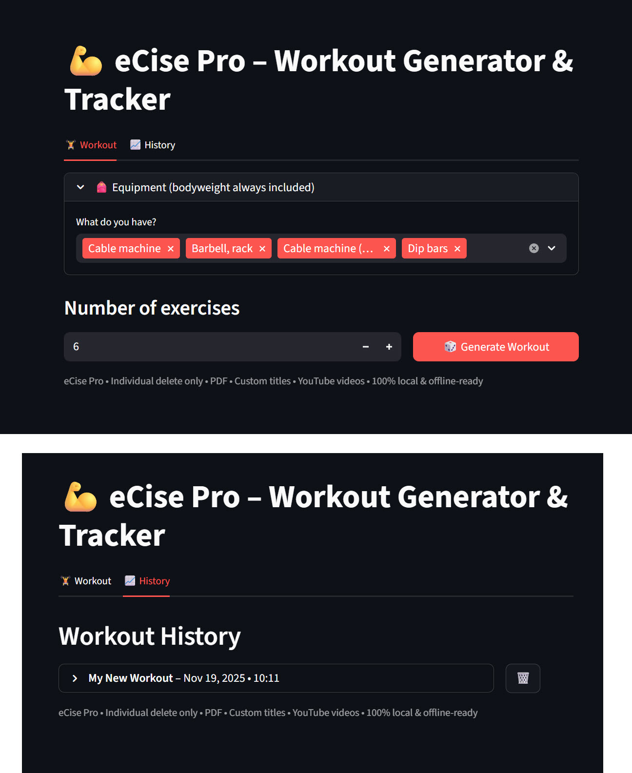 FeatureOld eCise.py (CLI)New eCise Pro (this one)InterfaceTerminal onlyClean Streamlit web UI, works on phone tooEquipment filterYesYes + multiselect with nice capitalizationRandom workout generationYesSame logic but now shuffles + lets you pick 1–25 ex.YouTube demo videosManual searchAuto-detected + smart fallbacks per muscle groupPDF exportNoYes – beautiful printable PDF with tables for loggingLog sets/reps/weightNoYes – right under each exerciseSave completed workoutsNoYes – with custom titleHistory pageNoYes – newest first, expandable, total volume metricDelete workoutsN/AIndividual delete only (no “clear all” button!)Offline-readyYesYes – caches everything locally