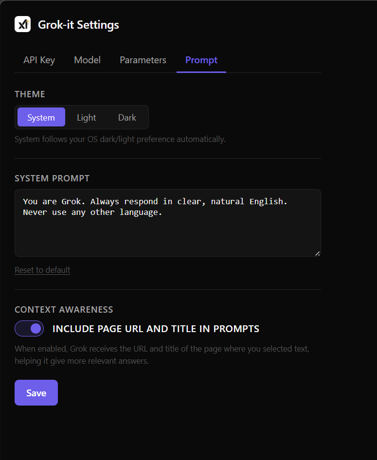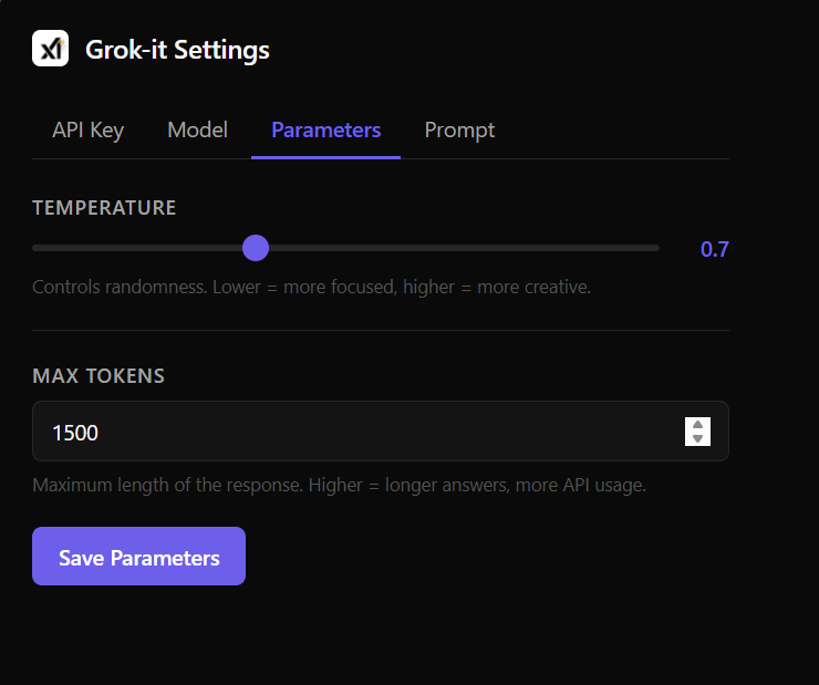 Controls the maximum length of Grok’s response. 1,500 tokens is roughly 1,100 words — plenty for most explanations. Raise it to 4,096 for long-form summaries, or drop it to 100–300 for snappy, concise answers that minimize API usage. The extension validates both values before saving and will show a red error rather than silently accept an out-of-range value.