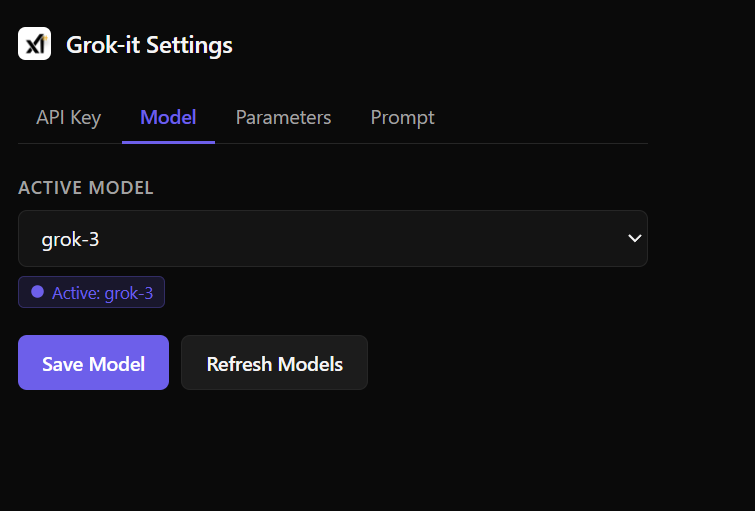 A dropdown populated with every Grok model available on your xAI account. The default is grok-3-mini, but you can switch to any supported model. A highlighted badge below the dropdown always shows the currently active model. Click Refresh Models at any time to re-fetch the list from the API without reinstalling the extension.