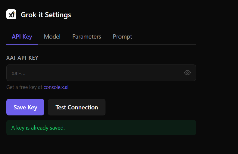 Click Test Connection. The extension will hit the xAI models endpoint with your key. If everything is working you will see a green success banner — something like “Connected — 8 models available.” At the same time, the extension automatically fetches and caches the full list of available Grok models so you can pick one in the Model tab.
