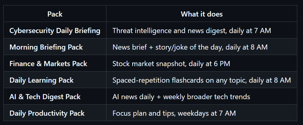 Community packs give you a gallery of ready-to-install agent collections — cybersecurity briefings, market snapshots, daily learning flashcards, productivity plans — imported with a single click