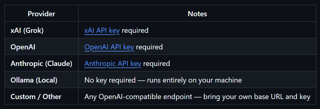 pip install, no version conflictsNo internet connection required to run the app itself — only the actual LLM API calls go out, to the provider you chose