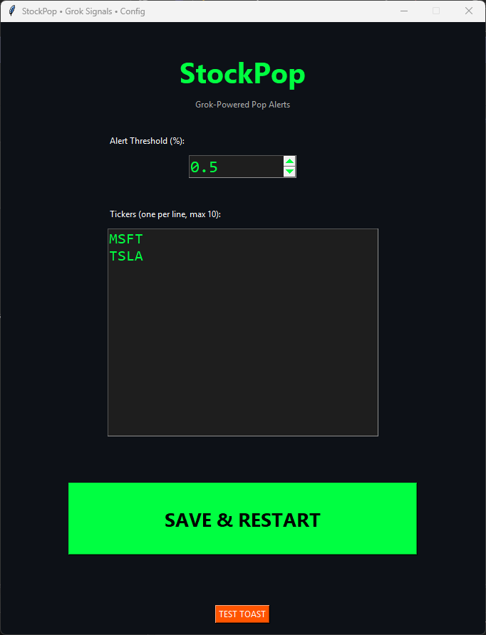 Stock Pop is a minimalist desktop app designed to run quietly in the Windows system tray. It uses the yfinance library to fetch real-time stock prices every minute and compares them against a user-set threshold (default 2%). If a stock’s price changes by that amount or more, you’ll get a desktop notification via the plyer library. The notification includes not just the price change details but also a concise trading signal from Grok AI—options like “Strong Buy,” “Buy,” “Hold,” “Sell,” or “Strong Sell,” followed by a one-sentence explanation.