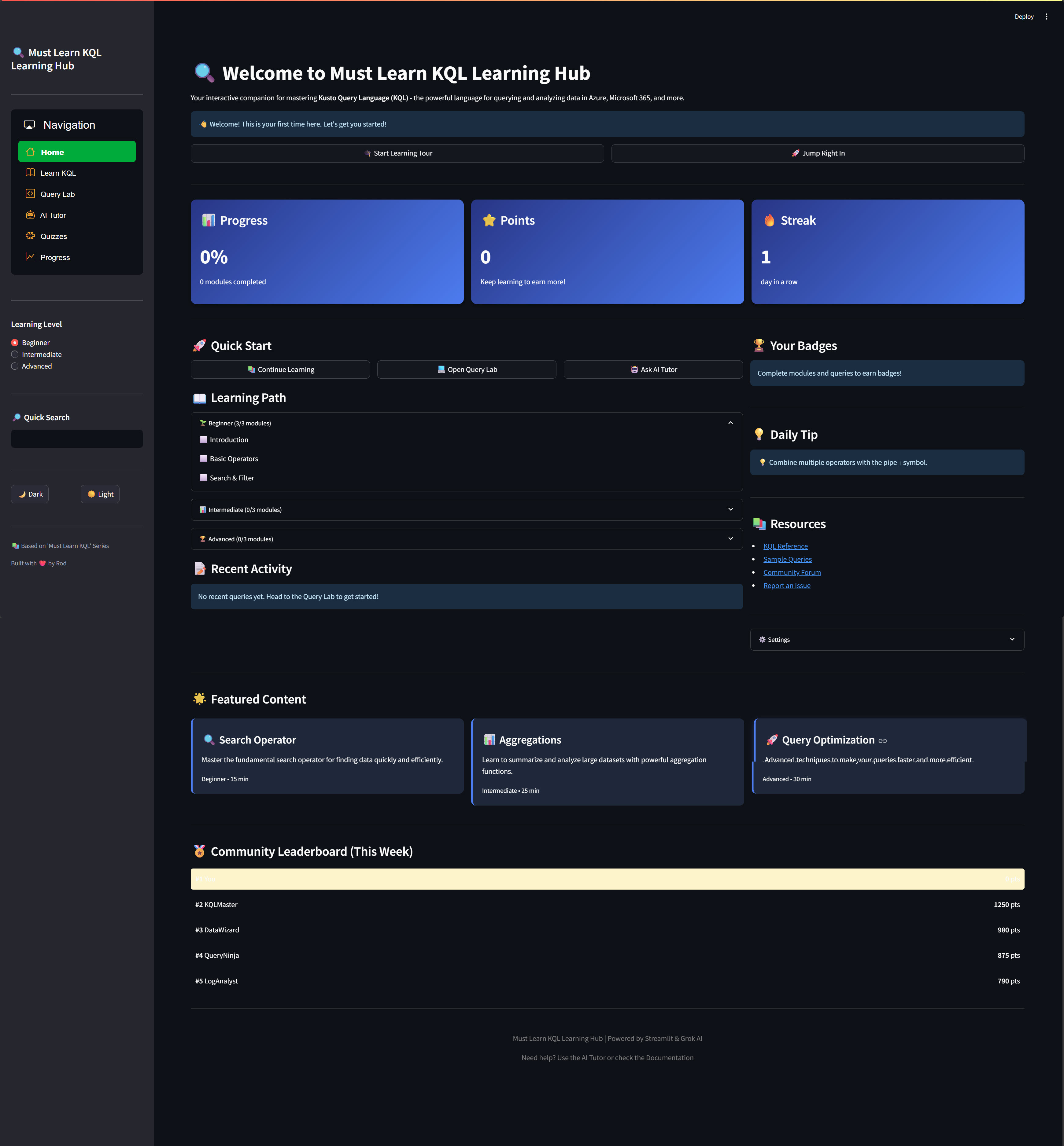I’ve built a free, open-source, AI-powered learning application that makes mastering KQL (Kusto Query Language) engaging, interactive, and effective. It’s like having a personal KQL tutor available 24/7, complete with interactive lessons, a query playground, quizzes, and gamification to keep you motivated.