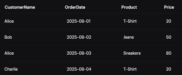 OrdersThis tells KQL to show you the entire dataset, like dumping the whole laundry basket on the floor. If you run this in Azure Data Explorer, you’ll see all the rows, like the table above. No filters, no fuss—just the raw data.