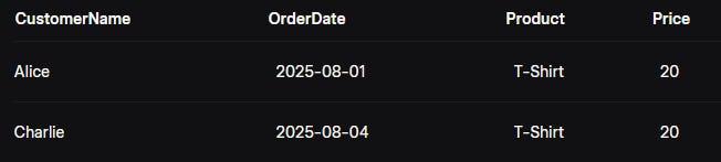 | where Product == "T-Shirt"This query says, “Show me only the orders where the product is a T-Shirt.” The == means “equals,” so you’re telling KQL to pick out just those items. The result would be: