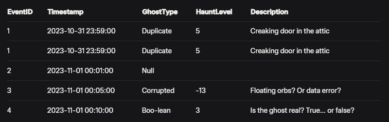 Ah, Null—the sly specter who haunts empty fields, turning useful data into voids. In our dataset, several rows have blank HauntLevel or Description. Null whispers, "Nothing to see here..." but we know better!