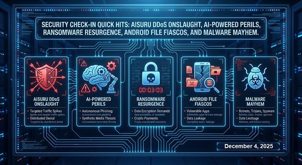 Security Check-in Quick Hits: AISURU DDoS Onslaught, AI-Powered Perils, Ransomware Resurgence, Android File Fiascos, and Malware Mayhem