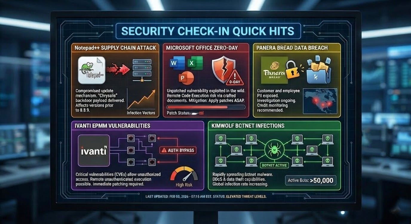 Security Check-in Quick Hits: Notepad++ Supply Chain Attack, Microsoft Office Zero-Day Exploitation, Panera Bread Data Breach, Ivanti EPMM Vulnerabilities, Kimwolf Botnet Infections