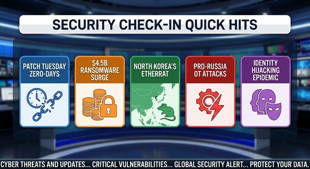 Security Check-in Quick Hits: Patch Tuesday Zero-Days, $4.5B Ransomware Surge, North Korea’s EtherRAT, Pro-Russia OT Attacks, and the Identity Hijacking Epidemic