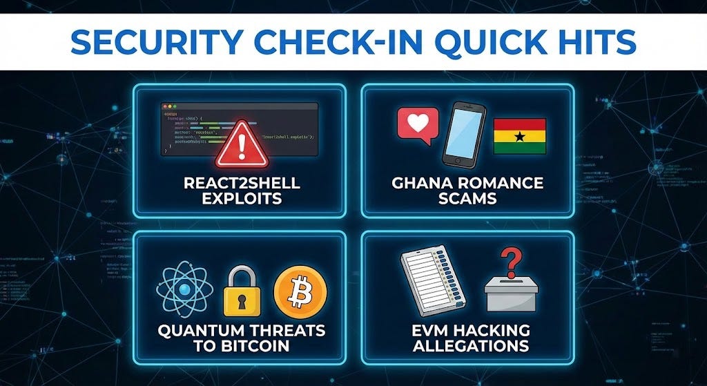 Security Check-in Quick Hits: React2Shell Exploits, Ghana Romance Scams, Quantum Threats to Bitcoin, and EVM Hacking Allegations